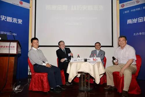 2014年7月1日,【朗润·中信书院】系列活动的第七期《两岸金融:从历史看未来》活动在北大国家发展研究院朗润园举办。来自海峡两岸金融界的管理者前台湾证券会主委戴立宁、全国政协委员、中国银监会原副主席蔡鄂生、北大国家发展研究院的金融专家徐建国和北大国家发展研究院EMBA校友、北京盛世景投资管理公司董事长吴敏文,分别从监管角度、学者角度和企业角度展开对话,探讨海峡两岸金融业发展的过去、现在和未来。